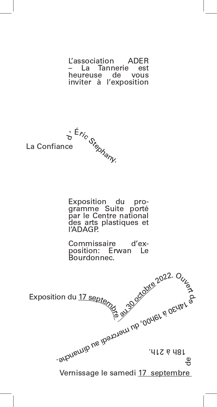 Affiche et carton d'invitation, 2023 Création d'un carton d'invitation ainsi que d'une affiche fictive pour l'exposition La Confiance d'Éric Stephany ayant eu lieu en 2022. L'objectif de ce projet était de créer des formes graphiques seulement à partir du texte.